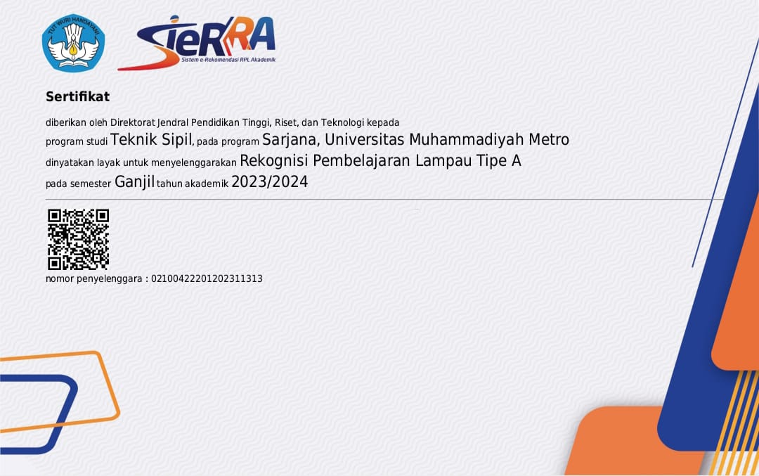 Program Studi Teknik Sipil Universitas Muhammadiyah Metro dinyatakan layak untuk menyelenggarakan Rekognisi Pembelajaran Lampau Tipe A dan mendapatkan Sertifikat dari Direktorat Jendral Pendidikan Tinggi, Riset, dan Teknologi sebagai keabsahan hal tersebut.