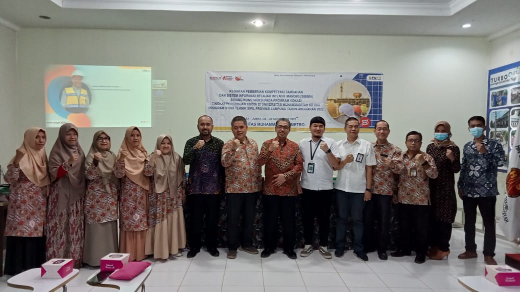 Pemberian Kompetensi Tambahan dan Sistem Informasi Belajar Intensif Mandiri (SIBIMA) Bidang Konstruksi pada Program Vokasi Tingkat Perguruan Tinggi di Universitas Muhammadiyah Metro di laksanakan di Gedung Aula Kampus 2 Fakultas Teknik Universitas Muhammadiyah Metro, Selasa (20/09/2022)